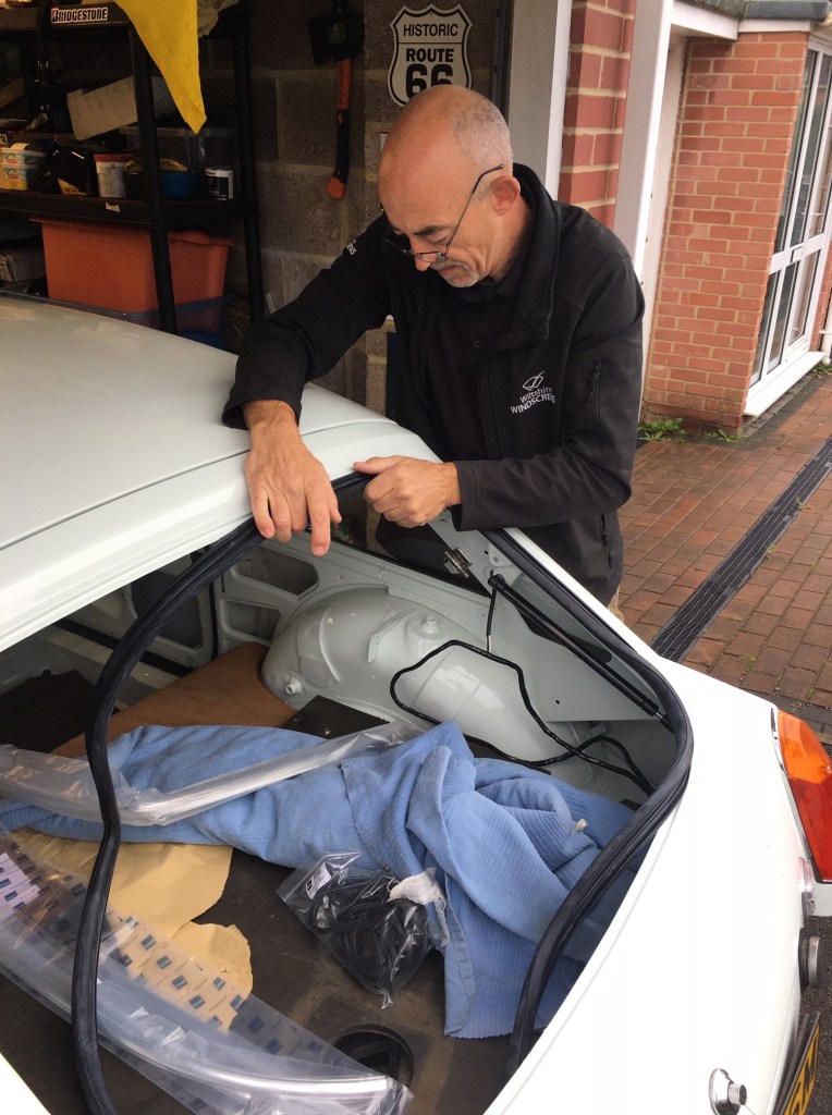 I arranged for Andy from Wiltshire Windscreens to come over to install the rear screen of the MG. I was working from home, but managed to keep an eye on progress between Skype calls. Andy battled with a slightly too long rubber seal, glass that wasn’t quite the right shape and trims that were recalcetrant. However, he had a cunning collection of tools and slippery products to work the screen in. I was pleased with how the job turned out and Andy is booked in for the following Monday to fit the Windscreen.