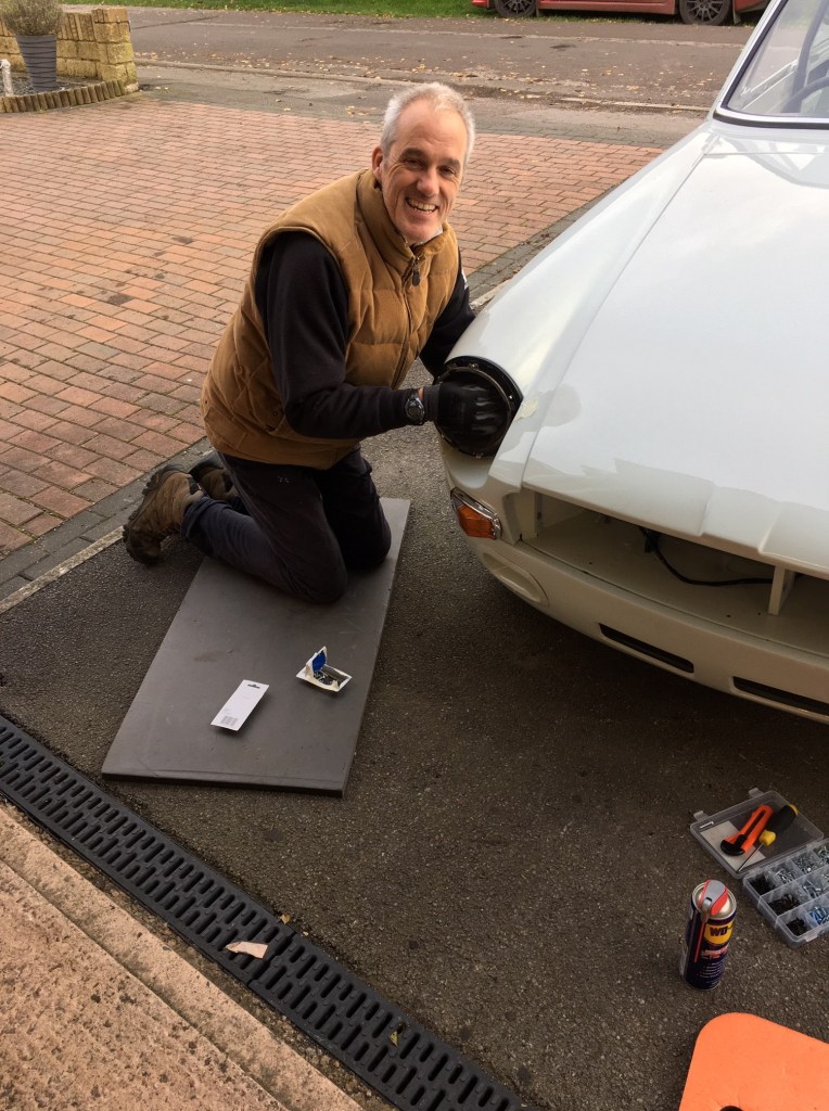 Paul had also come up to help me for the day. I wanted him to look at the o/s headlamp since I could not fit the bevel and it was causing me annoyance. We played around with the other unit (the one not fitted) and sort of worked out how it went on. We concluded that the unit was too tight to the seal to allow the bevel to hook up to the securing lip, so reluctantly removed it for a refit. I had used very short bolts because I didnt want the bolts protruding into the wheel arch, but on relfection I had gone too short and now the assembly didn’t work. While inspecting the lamps, Paul was recalling his days working on his Triumph 2500 that he had in his youth. Helpfully, he could still remember how the lamps went together and he did a good job dismantling and cleaning the unit which then looked much more presentable. After a quick visit to Halfords to buy some bolts, we assembled the lamp units in situ and to my delight, the bevels fitted. We weren’t completely sure that the lamps are as securely fitted as they need to be, but this was a step forward and like a lot of things on the car, once something is on, it can be endlessly fettled, and probably will be.