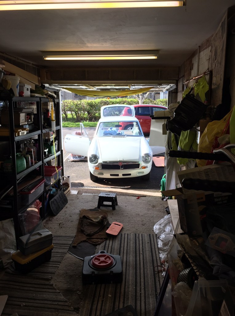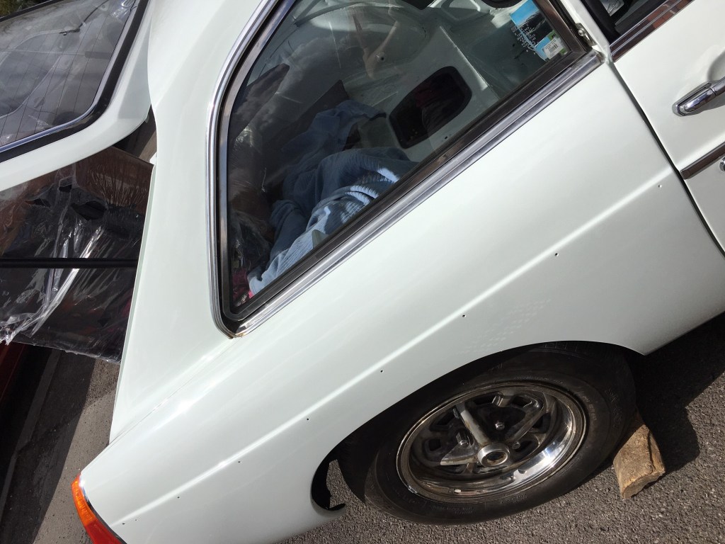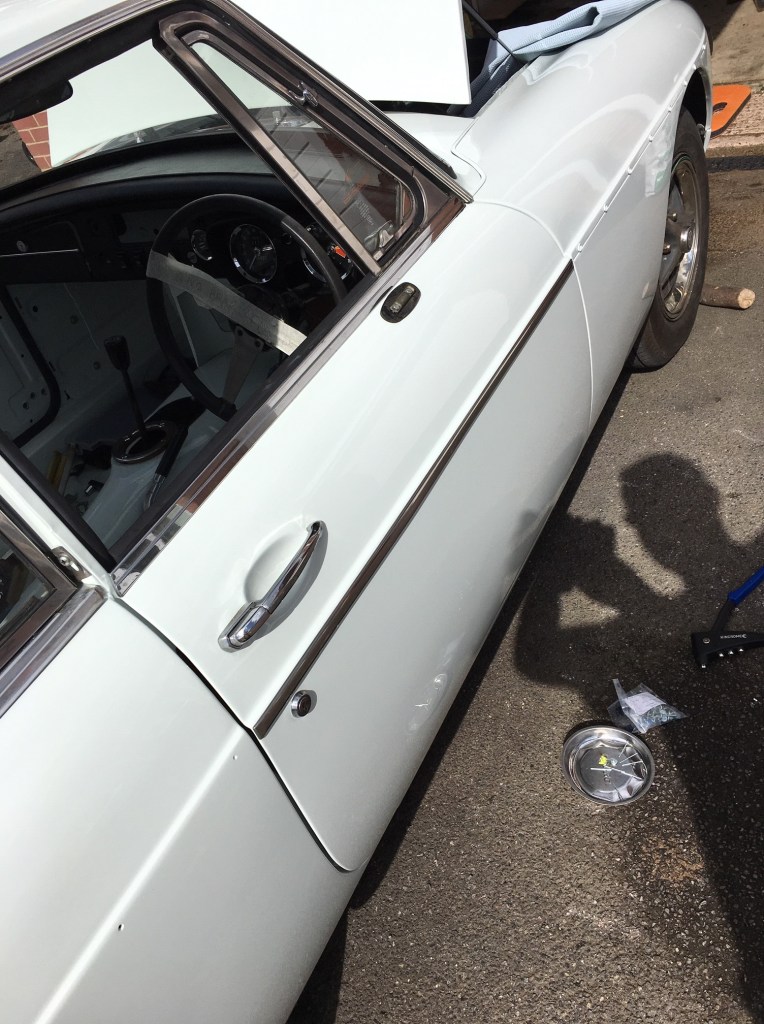 I am writing this a week later that it was done, so apologies for my tardiness. I spent a lot of time on this long weekend (Monday off) working on the MG, mainly fixing the external trims. The MGB is blessed with a striking stainless steel trim which runs down both sides, made up on three pieces, front wing, door and rear wing. Each trim snap fits onto a number of round fittings which are pop rivetted into the bodywork plus one screw plate per panel. The pop riveting went reasonably well, except that a couple of holes were too big for the pop rivet to take and so I had to miss these out. The o/s rear had a mislaigned hole so I had to miss that one out too. The front wing screw fittings needed to be drilled and I had a mixed experience with this. The n/s wing drilling went reasonably well – aligned well on the horizontal plane, I didn’t really get it far enough forward to completely pull the trim in. So learning this lesson on the o/s wing, I drilled further forward and although perfectly aligned for the trim, the thread came through next to a seam on the inner wing so I couldn’t fit the washed and nut. Annoyingly I had to leave the job partly done. Worth mentioning that the trims snap on nicely if you smack them sharply with the heel of your palm. Okay for the first couple of trims, but a bit painful by the end of the day.