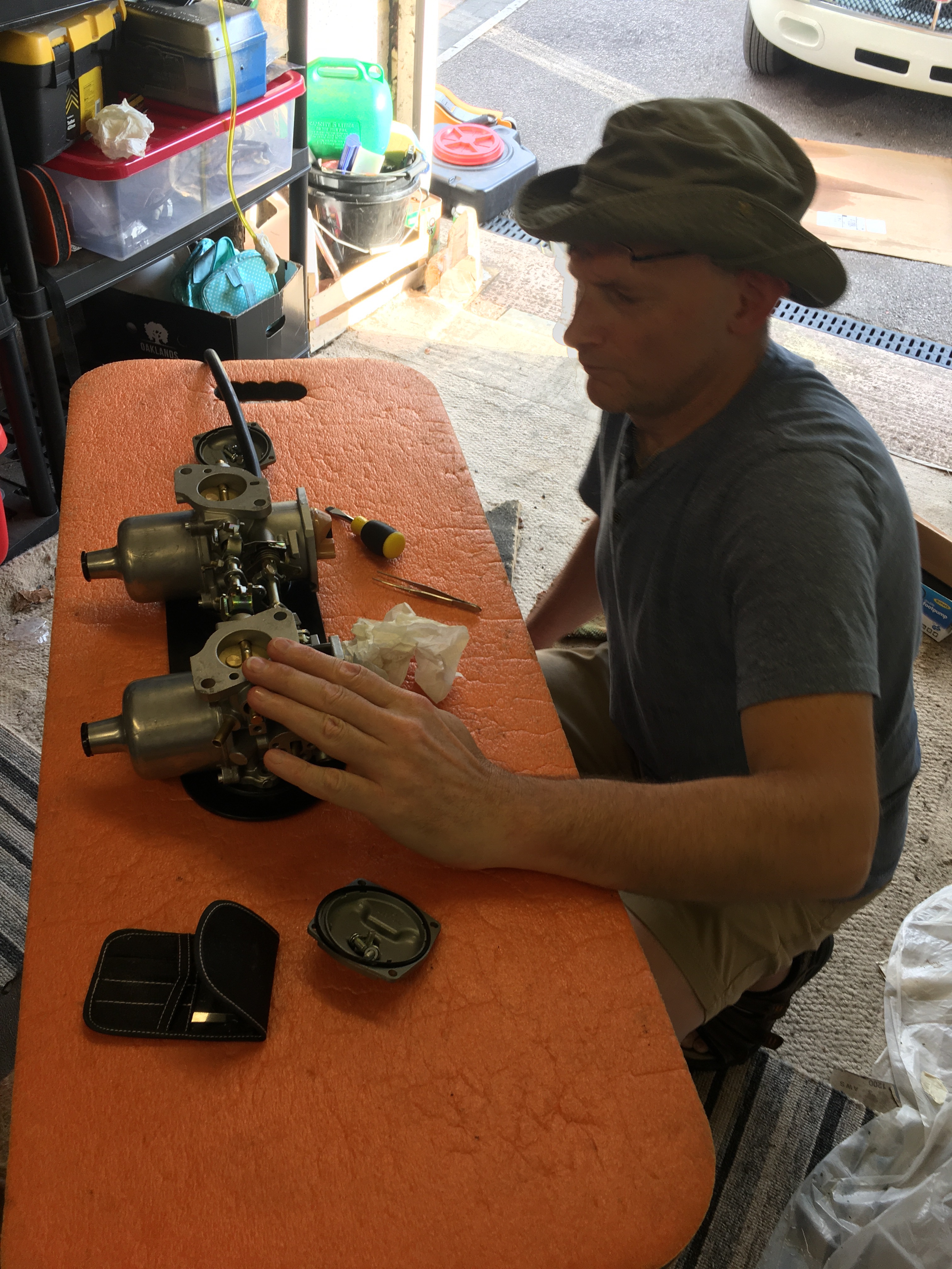 Step 3: Remove float chamber lids. These come off easily enough, although the ‘O’ ring on the front carb hopped out of its slot and showed little enthusiasm to pop back in. Using the footpump and with the float valve open we used the foot pump again to add pressure and with a nice ‘pop!’ the needle valve on the rear carb freed itself. Surely the front carb would do the same, but it wasn’t shifting, so John tickled it with a pair of fine tweezers and before long both carbs were wheezing along in harmony at each press of the pump. How satisfying.