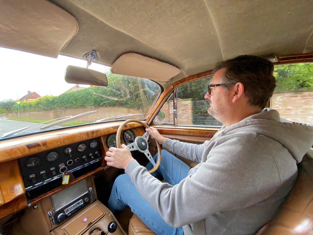 The route we were following had a really good mix of roads, from quiet country lanes to open B-roads and a little bit of A-roads. During the drive, I was starting to discover a dual character to this old Jag. Its first character is all about burbling around in the big squishy seats, enjoying the view and using the torque of the engine to pull you along with minimal changing gear. As we pottered through a narrow country late, I pulled over to let some cyclists come through – the lead cyclist mouthed ‘nice car’ and waved. I agreed! The other character of the car is when you have room to give it some welly in second, snick it up into third, give it some more welly, attain a pretty good turn of speed and then fling it into forth. For an old car, the acceleration is brilliant and the gearchange is really slick once you’ve got the feel of it. In this mode, the Jag is a racing machine, apparently lapping up this kind of treatment. It has to said, with open throttles, at higher revs, it was very noisy, with induction roar, exhaust blare, gear whine and wind noise all contributing to a glorious din. In addition, heat was wafting up the gearlever gaiter from the gearbox – a multi sensory experience!