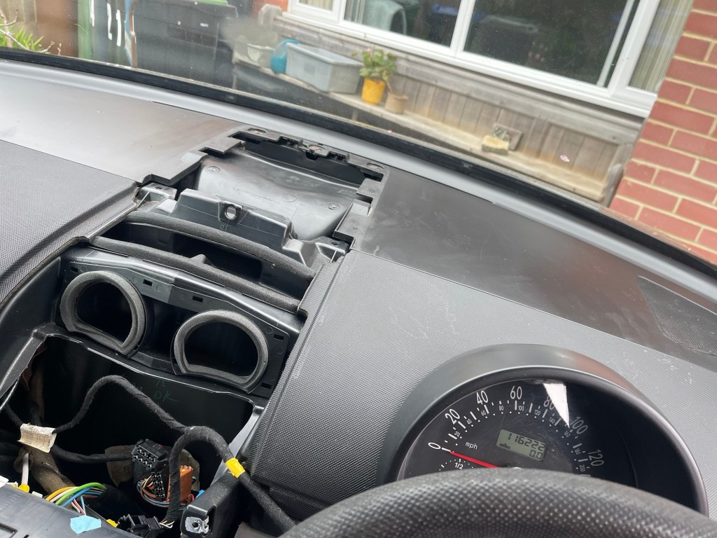 I had removed the centre dashboard panel to replace the hazard switch but I was having real difficulty finding the correct part in all the usual internet places. I got a correct looking switch but it was the wrong alignment and although I tried cobbling a Frankenstein switch made up of the old and the new I reached a dead end. Cue refund and another approach. I even considered remounting the hazard switch where it’s put on the later model but this would bring other complications such as having mismatched dashboard parts.