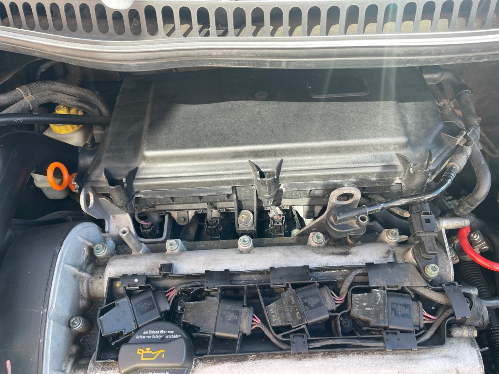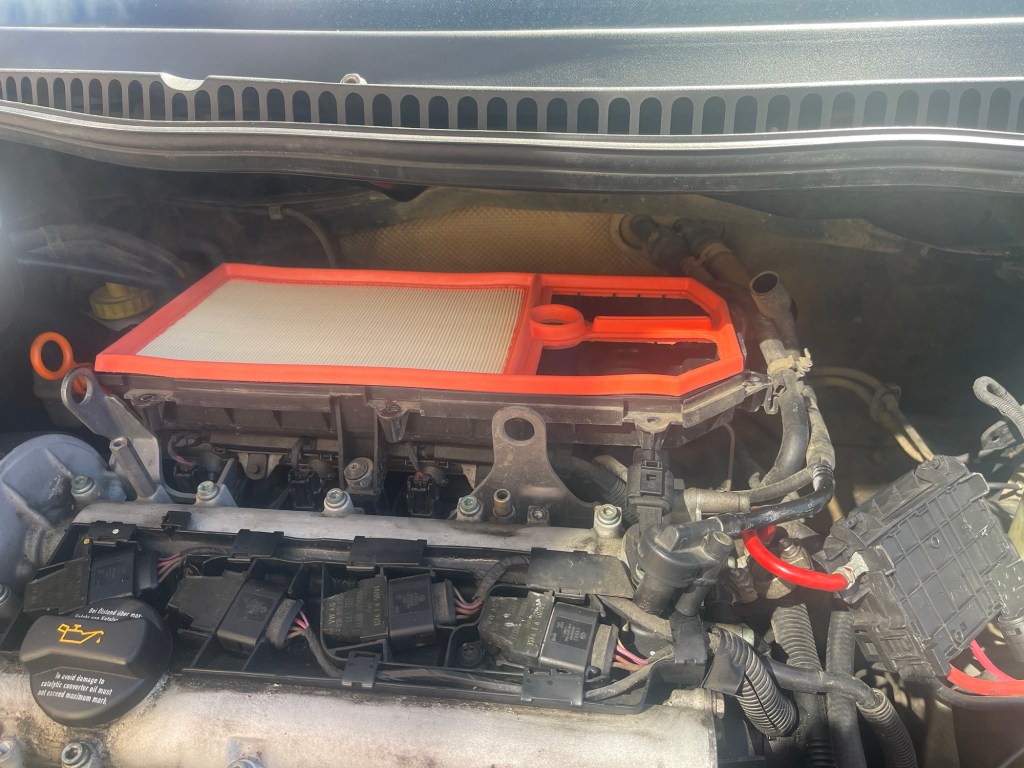 As it was a nice sunny day I then went under the bonnet to fit the new air filter and this went fine although the incredibly tight space to fit the rear screws was as hard to do up as it was to undo. I also put back the plastic engine cover which I had cleaned.