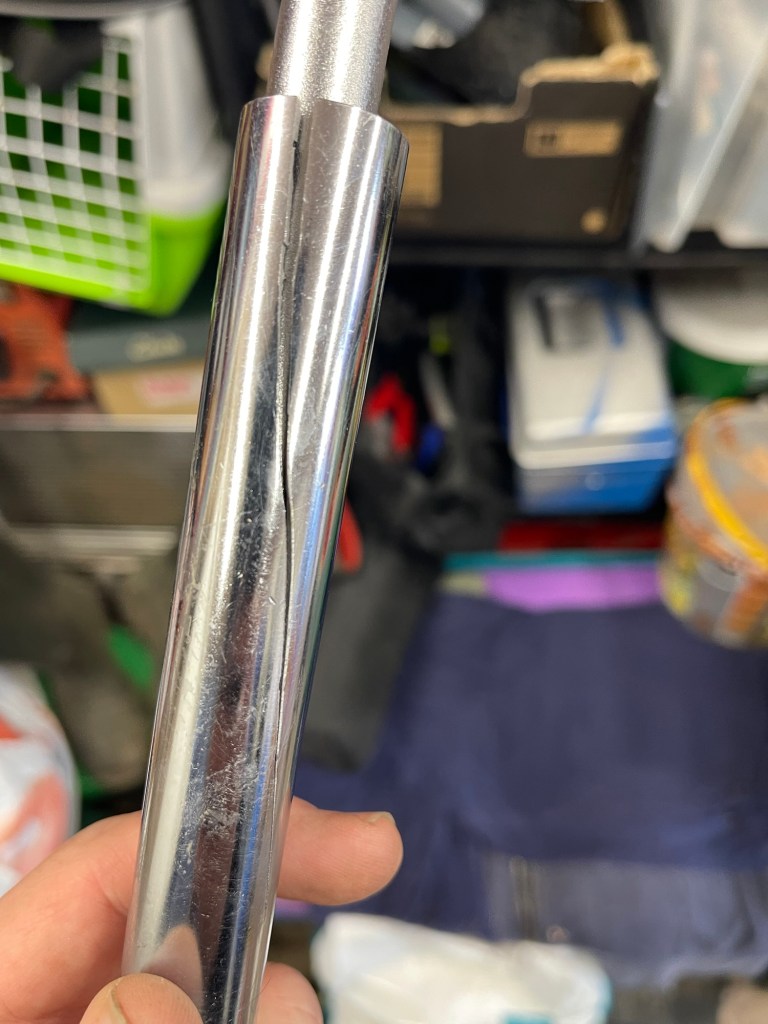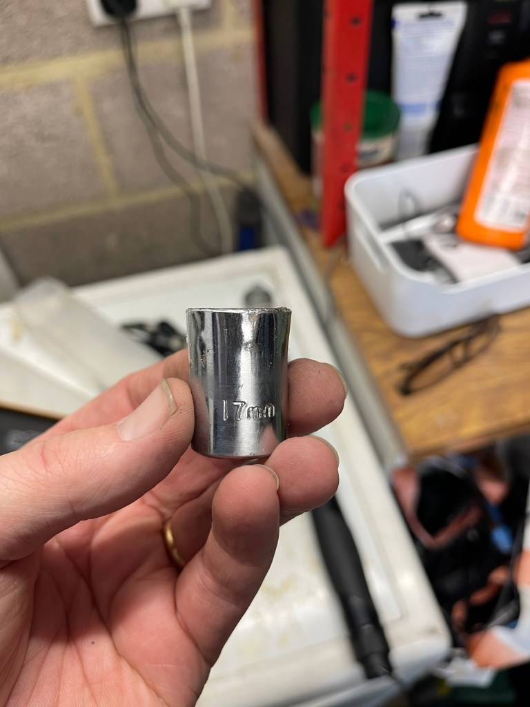 Giddy with excitement I went to loosen the rear wheel studs which had apparently been put on by an ape. Hmmm. I was using my old wheel nut wrench with its useful extension which usually has the upper hand, but after loosening each nut by standing on it (approx 98kg) and breaking the bond with a rifle like crack the poor old wrench was split. Damn. As was my 17mm socket which was pretty stretched. Damn. Fortunately not my best 17mm socket.