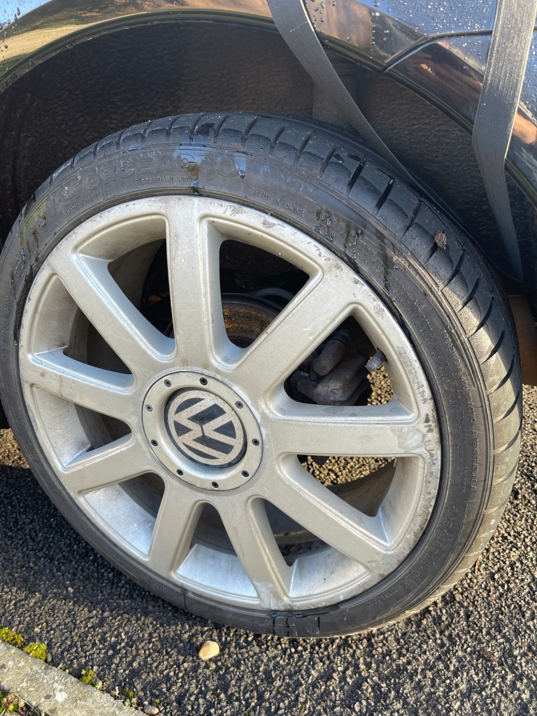 Here’s a record of my first experience of refurbishing an alloy wheel. The alloys on Lou’s VW Beetle were pretty beaten up, despite having been professionally refurbished three years ago. A combination of factors – a low profile (40 section) tyre and difficult visibility of the car’s extremities meant that they had extensive scuffs. There are lots of companies offering wheel refurbishment (I have had previous cars done in this way) but something made me want to have a go at these wheels myself and see what sort of standard could be achieved using hand tools and spray cans.
