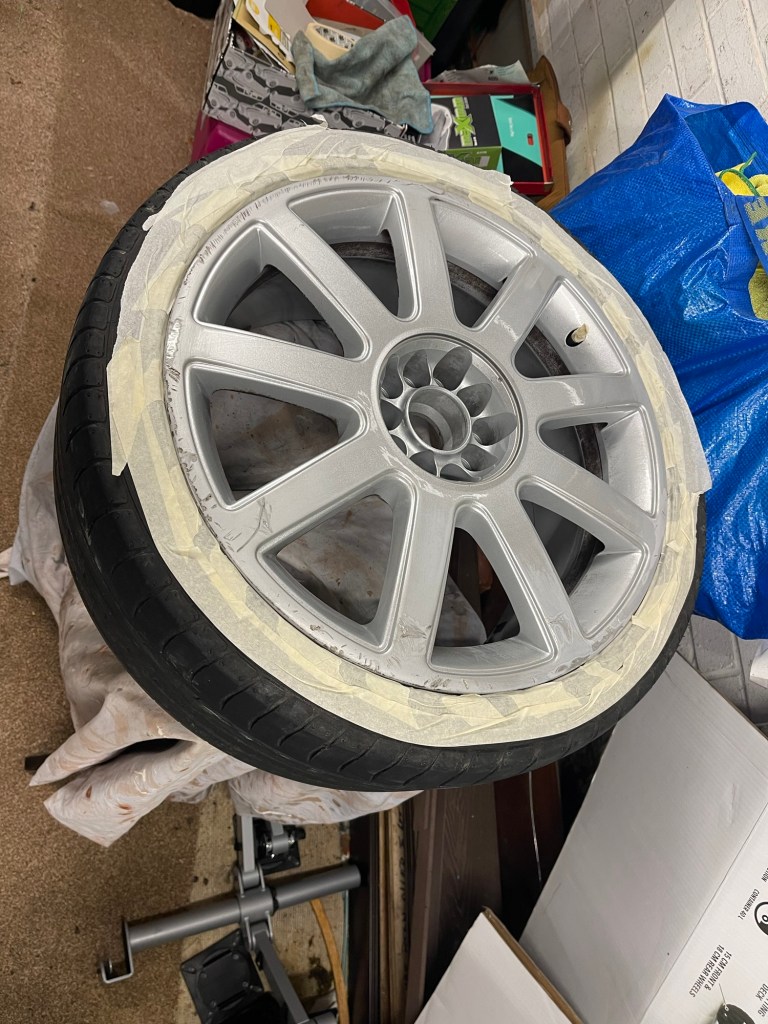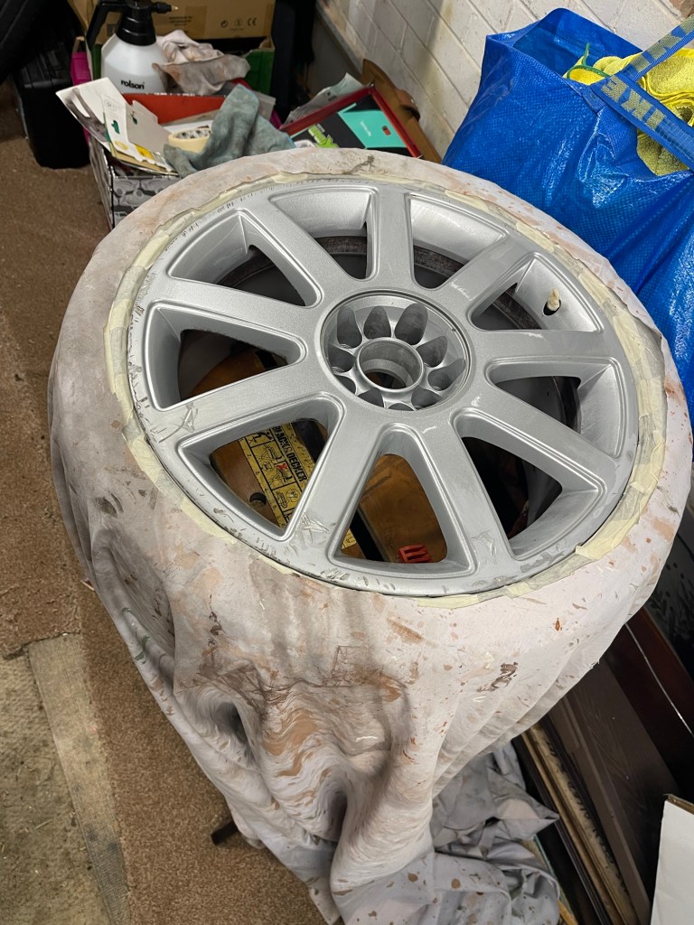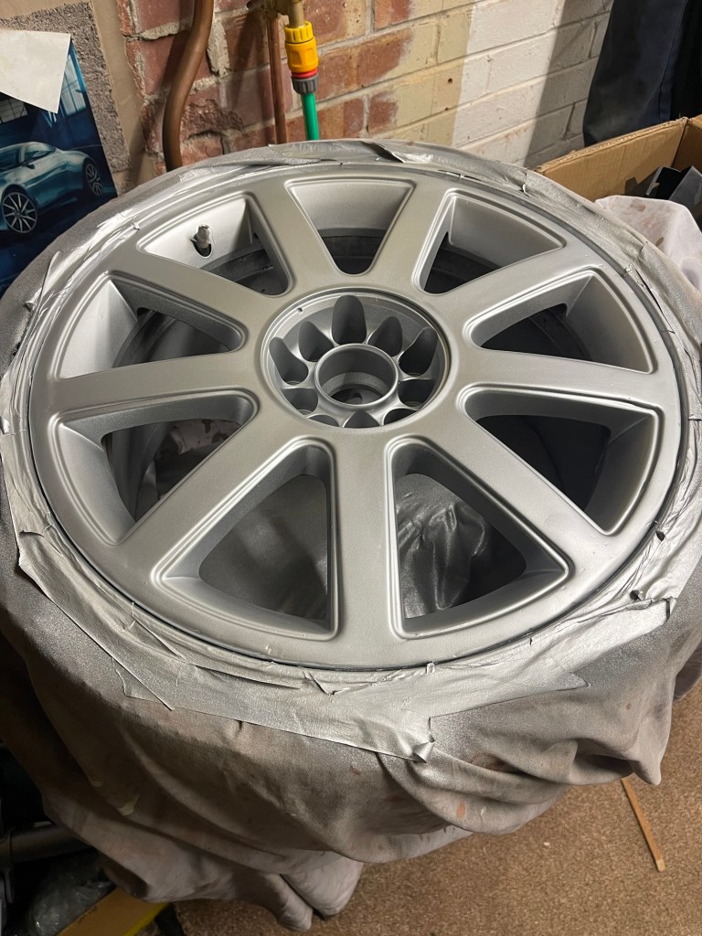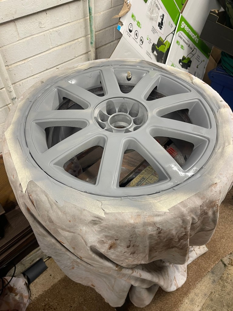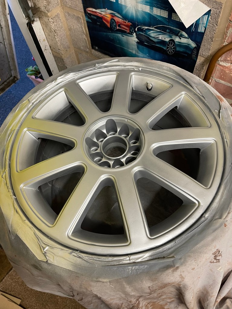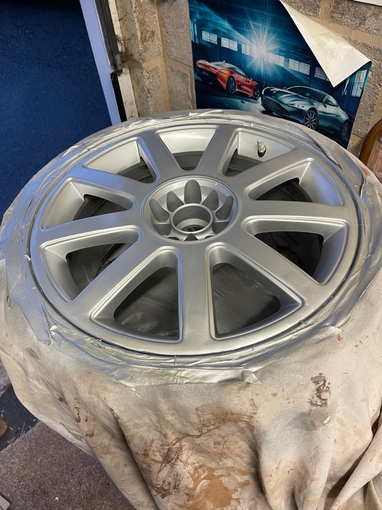 After several evenings sanding the filler I got to the point of just wanting to get some paint on it. I applied about four coats each of primer, colour and lacquer. I used a heat gun to gently warm the wheel as the ambient temperature in the garage was in single figures and after each coat I used the gun again to encourage the drying process. I was reasonably happy with the overall result which is less sparkly metallic than the professional finish from a paint gun, but not bad from a rattle can.