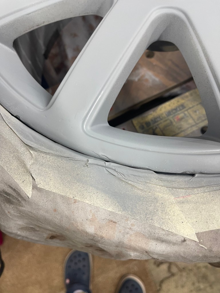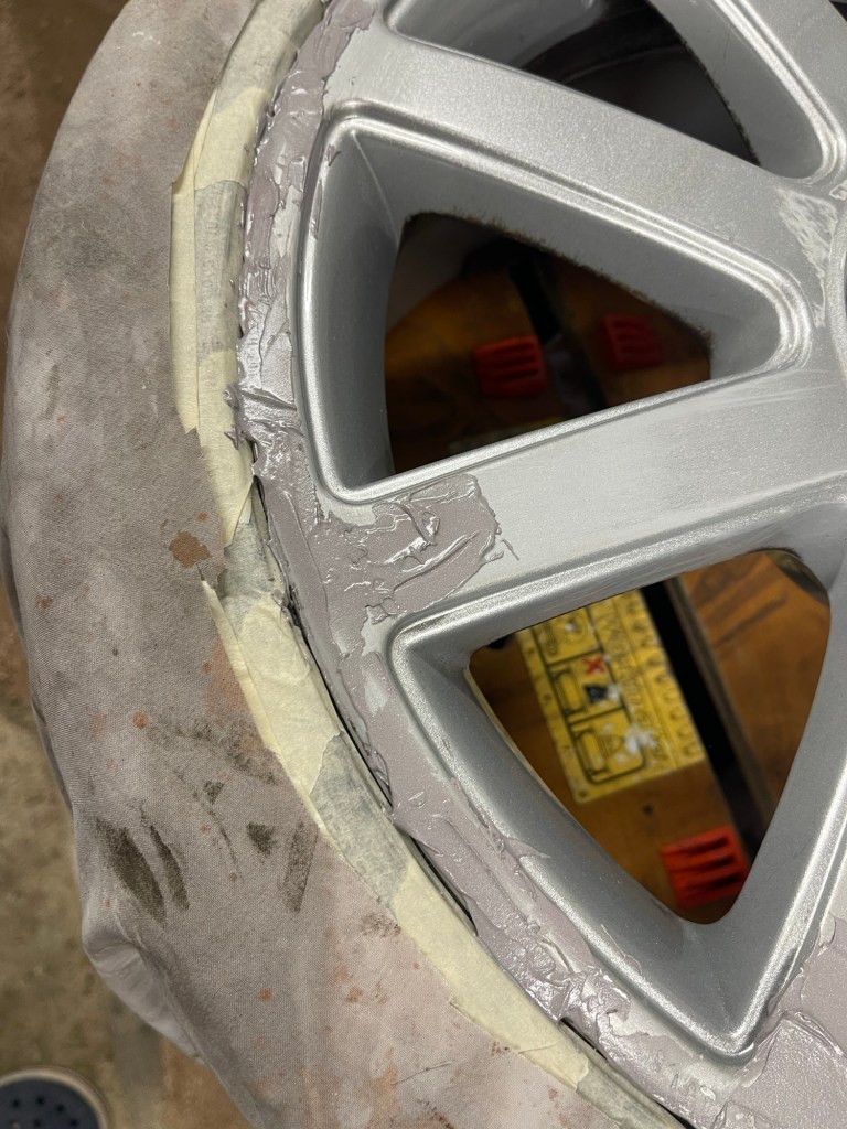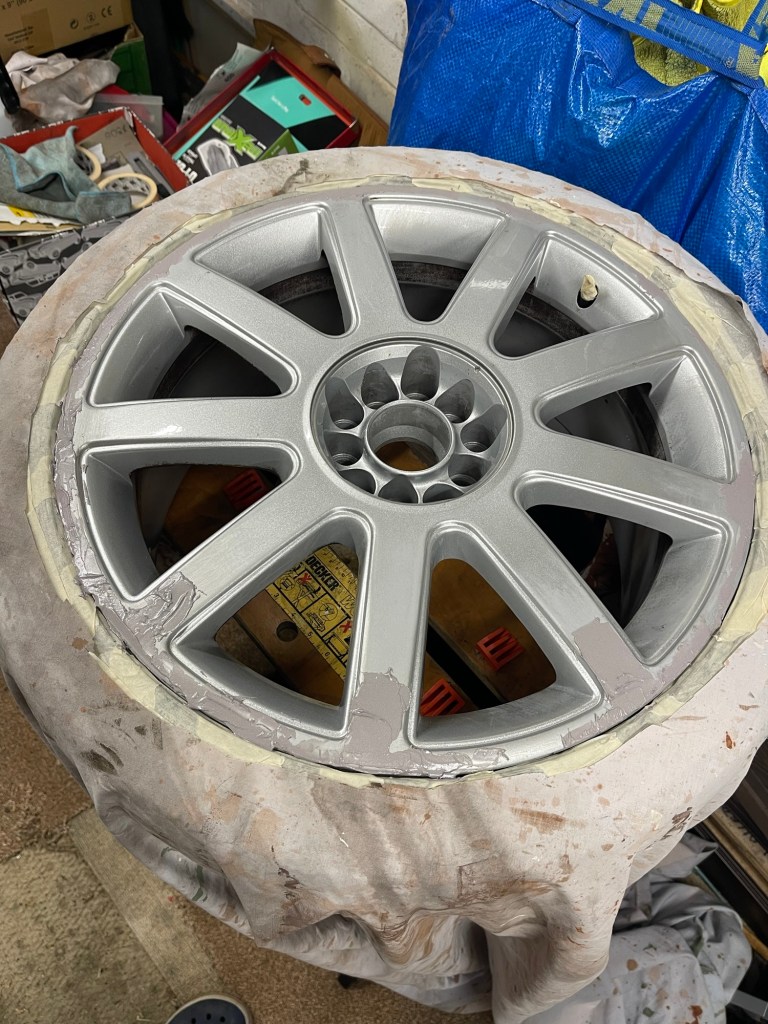 I used some alloy wheel filler to fill in the deeper scuffs and then used grades of sandpaper to rub them smooth. This was the most time consuming part of the exercise as the filler cures extremely hard – there is a careful balance to strike between rubbing the filler down to nothing with course paper and seemingly having no effect with the finer stuff. This is really not my forte and I regretted those areas where ‘put plenty in’ had been my approach, creating me a lot of avoidable work. Further, it is very hard to accurately replicate the profile of the alloy wheel which has subtle curves and radiuses. Also, I had decided to keep the tyre in place and just deflate it and this caused a problem trying to get a good edge to the rim. For a wheel in bad condition I think it would be better to remove the tyre.