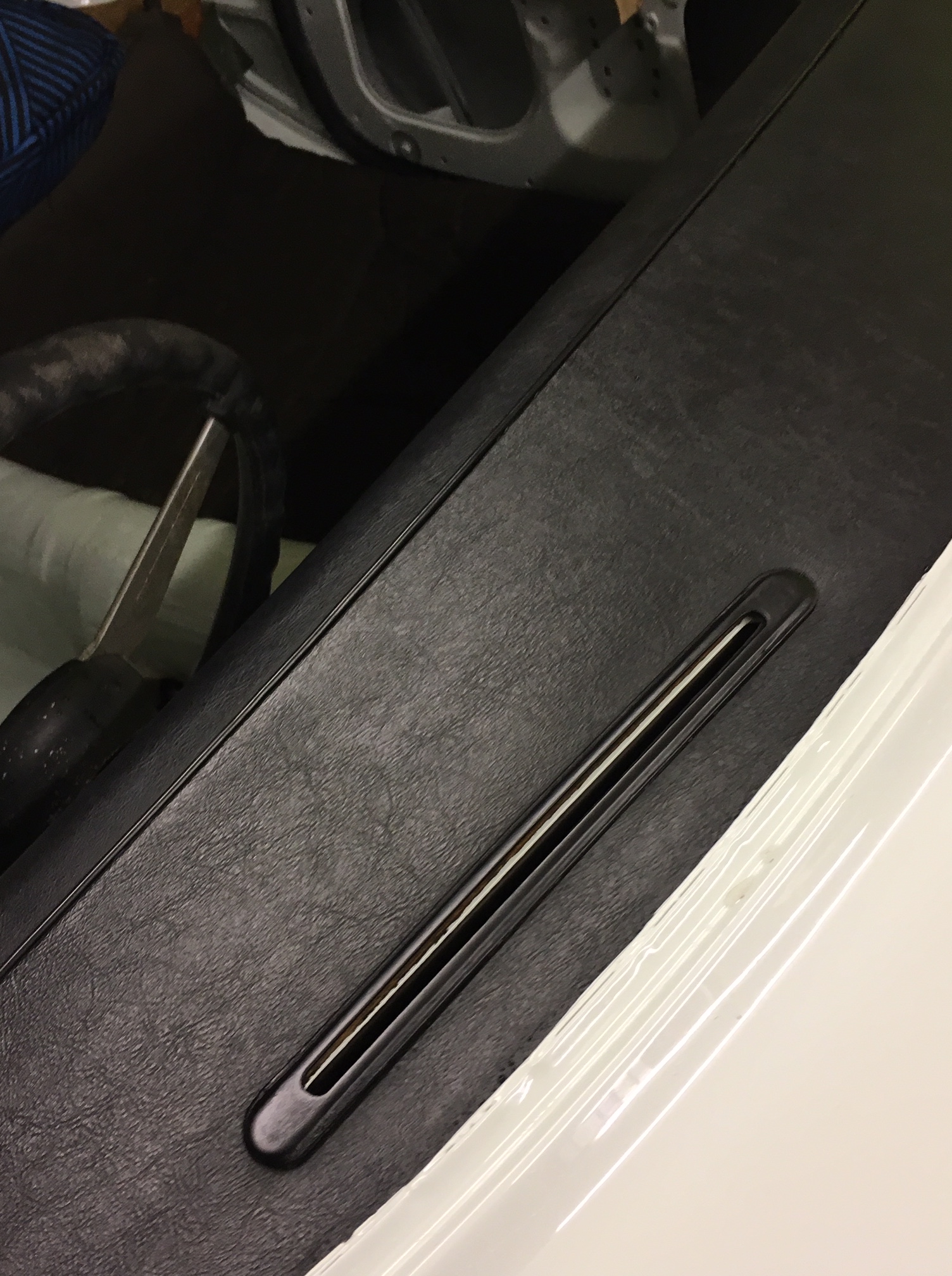 So I bolted the quarter lights back on to the doors, easy enough as I could remember how they came off. It was a bit awkward feeding the leg through the narrow slot at the top of the door without scratching the new paint, so I wrapped the end in a cloth bag and eased it through the gap at the middle of the door where I could make a bit more room. After this I was reacquainted with the very long threads on the bolts and the restricted access to them.