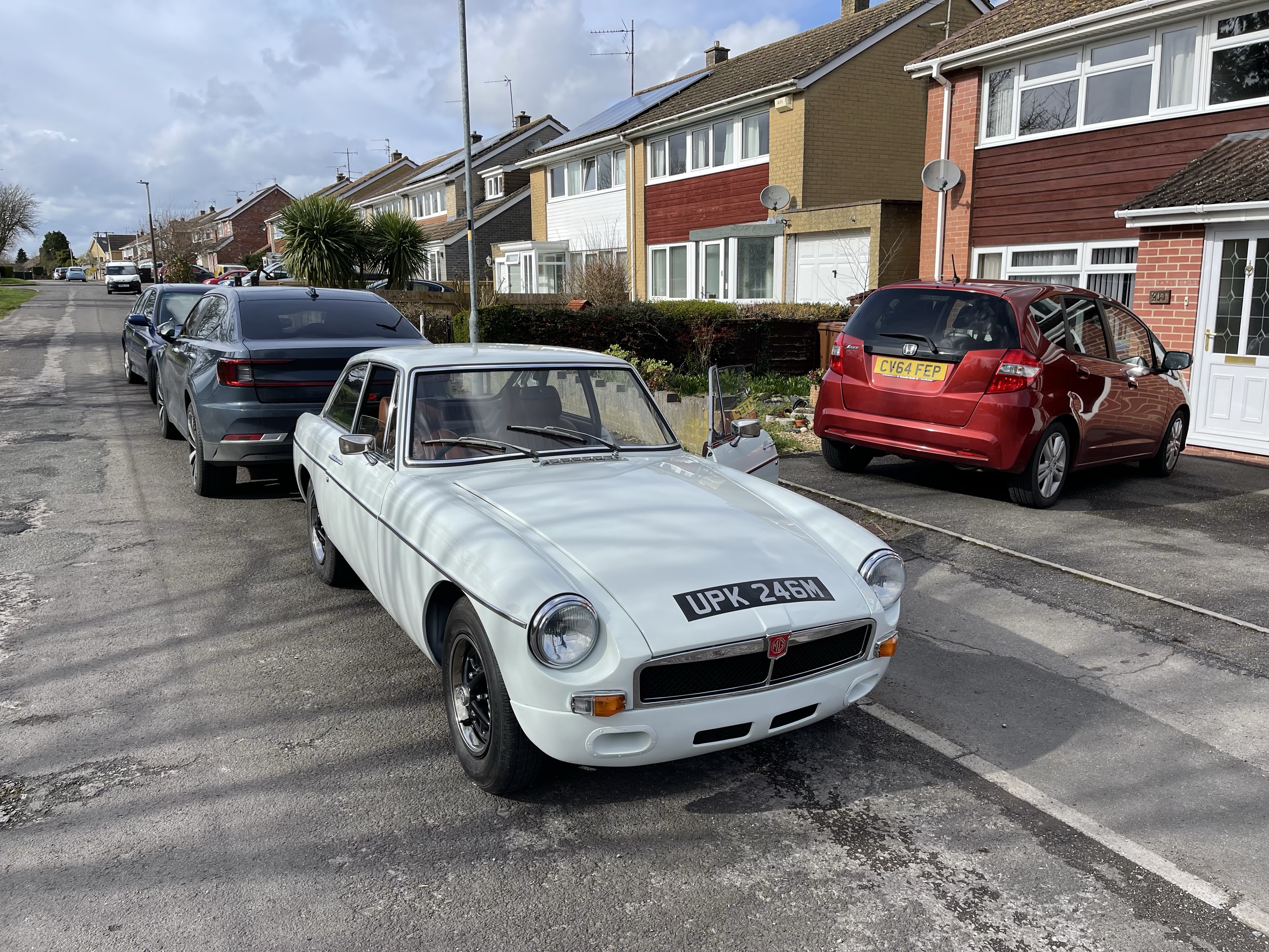 I finished off the day with a quick test drive of about 2 miles (brave!) with Mrs T on board. This was Helen’s first time in the car and the first time I had driven it out of our estate in the three years I have had it. It was also the first time the car has driven more than about quarter of a miles in around ten years. I had already warmed up the engine and done some checks looking for leaks and we were good to go. Its quite intimidating driving a car that you’ve restored for the first time, being conscious of everything that can go wrong I suppose and also nervous of other traffic. However all was well and were were able to go through the gears into fourth and to cruise very briefly up to 50mph. The drive illustrated a few things, firstly that the hatch needs to be finished off with the rubber seal I have bought and the catch adjusted to stop it banging up and down, and the carburettors need tuning as the car is not pulling cleanly through the revs. The gearbox was a pleasant surprise, being nice and slick to shift although I dig get a ‘box full of neutrals’ at one roundabout while I grounds the gears. Fortunately, the MGB is torquey enough to pull out of the roundabout in third, although this coincided with the flat spot I mentioned so we sat at 32 mph with a BMW following curiously behind on our 50mph limit bypass. Helen commented favourably on the comfort of the seat, but noted the loud exhaust. With the car only partly trimmed and with a lot of grommets still to locate, I think I can tone down the noise a bit, and also I need to check the exhaust it properly done up. have to say, it does sound good and was turning heads. A good day!