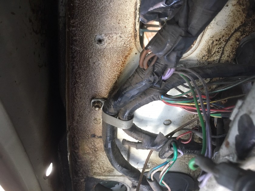 Today I rolled the MG out onto the drive and loosened a couple of bolts, one of which clipped the loom to the under-dash and the other which was an earth for something or other. I didn’t really have much time, but I had a good look where the loom from under the bonnet enters the car through the firewall – there is an intact grommet which I will have to remove and I have heard that its a tight fit to feed the cables through, just a matter of being patient I think.